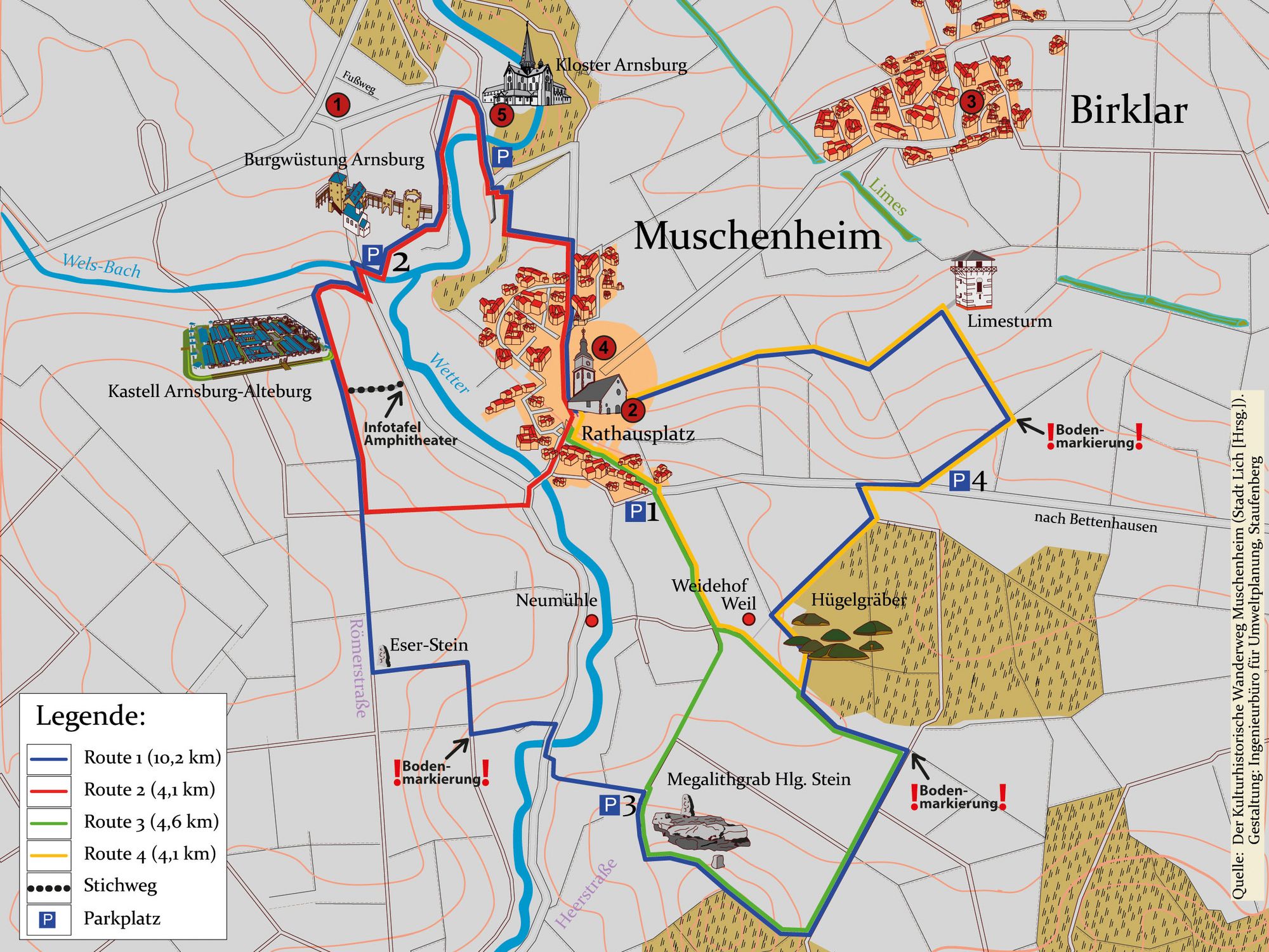 Der Weg unterteilt sich in vier miteinander verbundene Routen von einer Länge von 4 bis 10 km. Nähere Informationen erhalten Sie unter www.natur-muschenheim.de/kulturhistorischer-wanderweg/