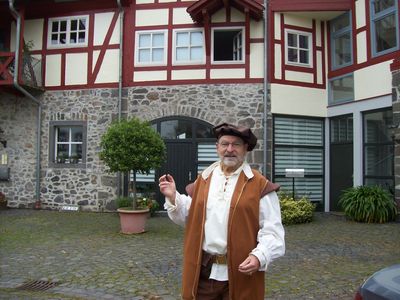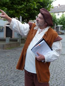 In seiner Führung durch die Altstadt von Lich versteht es E. O. Finger mittels kleiner Anekdoten anschaulich und unterhaltsam die Bedeutung der Fachwerkgebäude zu vermitteln.