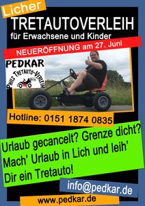 Licher Tretautoverleih, Philipp Langstroff, Oberstadt 44, 35423 Lich, Tel.: 0151/18740835, info(at)pedkar.de, täglich geöffnet von 9.00-21.00 Uhr