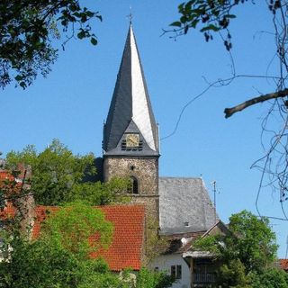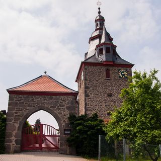 Die geostete Kirche am südwestlichen Dorfrand steht erhöht auf einer Basaltkuppe und prägt das Ortsbild. Der ummauerte Friedhof war befestigt und soll vier Rundtürme mit Schießscharten gehabt haben. Erhalten ist das überdachte Torhäuschen aus spätgotischer Zeit. Hinter der Kirche schaut eine moderne Holzstatue Martin Luthers über die Ebenen und auf den Lutherweg Richtung Süden.