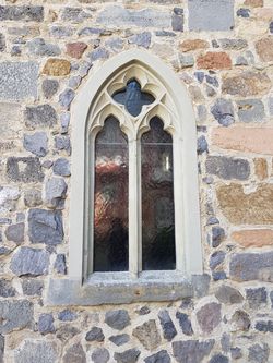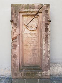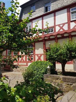 Die Fachwerkteile stammen alle aus der nach-reformatischen Umbauzeit, als Landgraf Ludwig IV. das Schloss zum Wittum seiner Gemahlin Hedwig bestimmte. An der Hofinnenseite eingemauert sieht man im vertieften Feld eine Mönchsfigur mit dem Antoniterkreuz auf der Brust, das zwei Wappenschilder, das hessische und das mecklenburgische, hält.